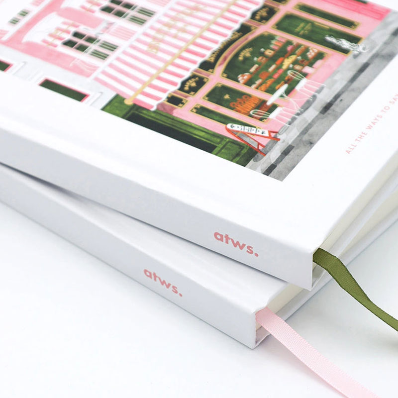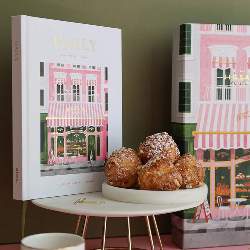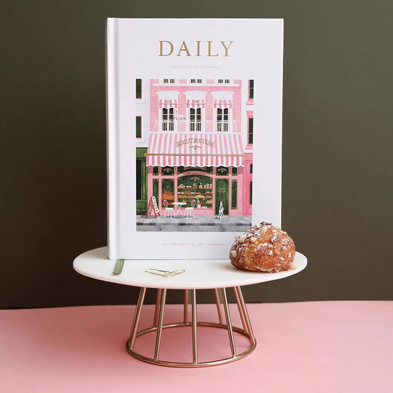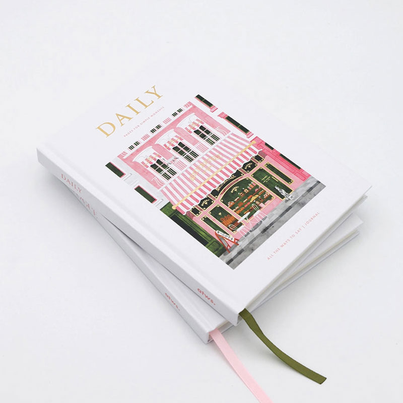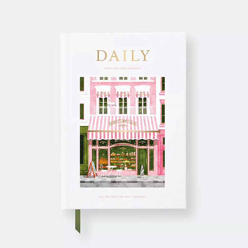 Το Daily Bakery Hardcover Notebook A5 αποτυπώνει το ζεστό πνεύμα ενός γαλλικού ζαχαροπλαστείου. Το λευκό σκληρό του εξώφυλλο είναι εικονογραφημένο με μια γοητευτική ροζ και πράσινη βιτρίνα, ενώ χρυσές λεπτομέρειες προσθέτουν μια εκλεπτυσμένη πινελιά. Στο εσωτερικό, 220 σελίδες με γραμμές αποτελούν τον τέλειο καμβά για ημερολόγιο, σχεδιασμό ή καθημερινές σκέψεις. Ένας σελιδοδείκτης με κορδέλα το καθιστά πρακτικό και κομψό ταυτόχρονα.