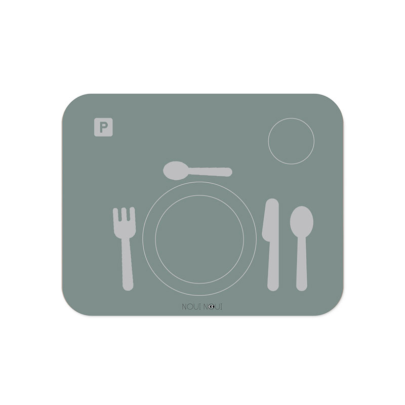 The child can park its favorite toy on the parking sign during the mealtime or maybe even better, the parent can place a little dessert. A fun and learning placemat.