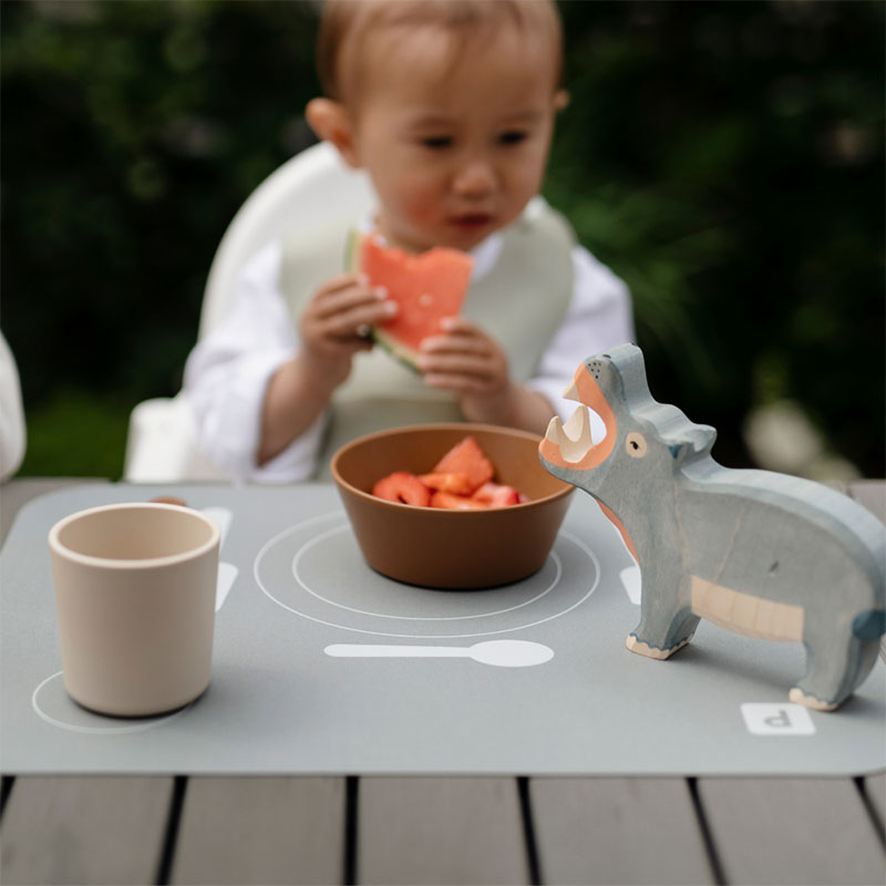 The Granite grey placemat ‘learning table setting’ is part of our new Learning Mat collection. The outlines illustrate the child where to put the cutlery, the plate and the cup in a very simple and fun way.