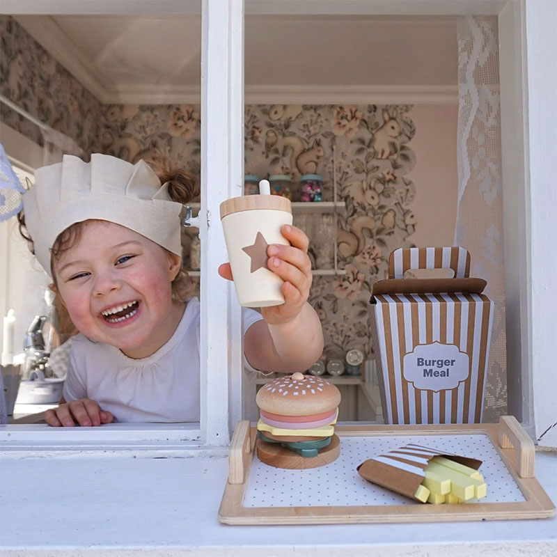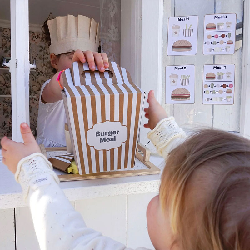 Τέσσερις κάρτες μενού προτείνουν διαφορετικούς συνδυασμούς ανάμεσα στα burger, τις τηγανιτές πατάτες και το συνοδευτικό ρόφημα, αφήνοντας τη φαντασία του παιδιού να καθοδηγήσει το παιχνίδι. Ένα παιχνίδι που ενθαρρύνει τη δημιουργικότητα και το διαδραστικό παιχνίδι ρόλων.
