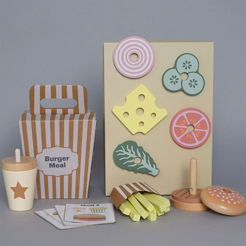 Με το φανταστικό σετ burger, τα παιδιά μπορούν να δημιουργήσουν αμέτρητα λαχταριστά γεύματα, εμπνευσμένα από τις κάρτες μενού που περιλαμβάνονται. Το burger είναι στοιβαζόμενο, επιτρέποντας στο παιδί να επιλέξει μόνο του ποια υλικά θα προσθέσει σε κάθε παραγγελία.